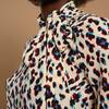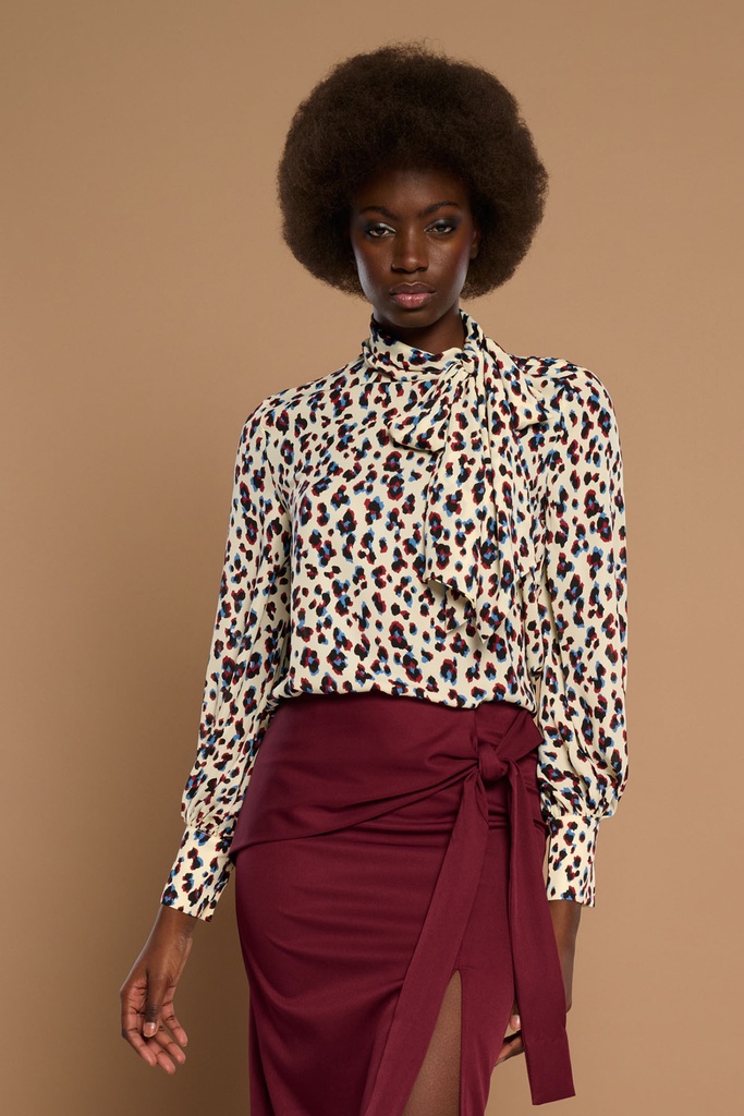 Blusa de cuello perkins y manga larga acabada en puño. Lazada lateral en cuello. Estampado animal print. Cierre con cremallera en hombro oculta en costura.